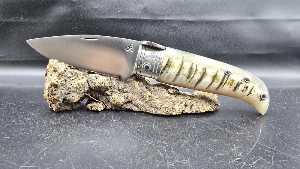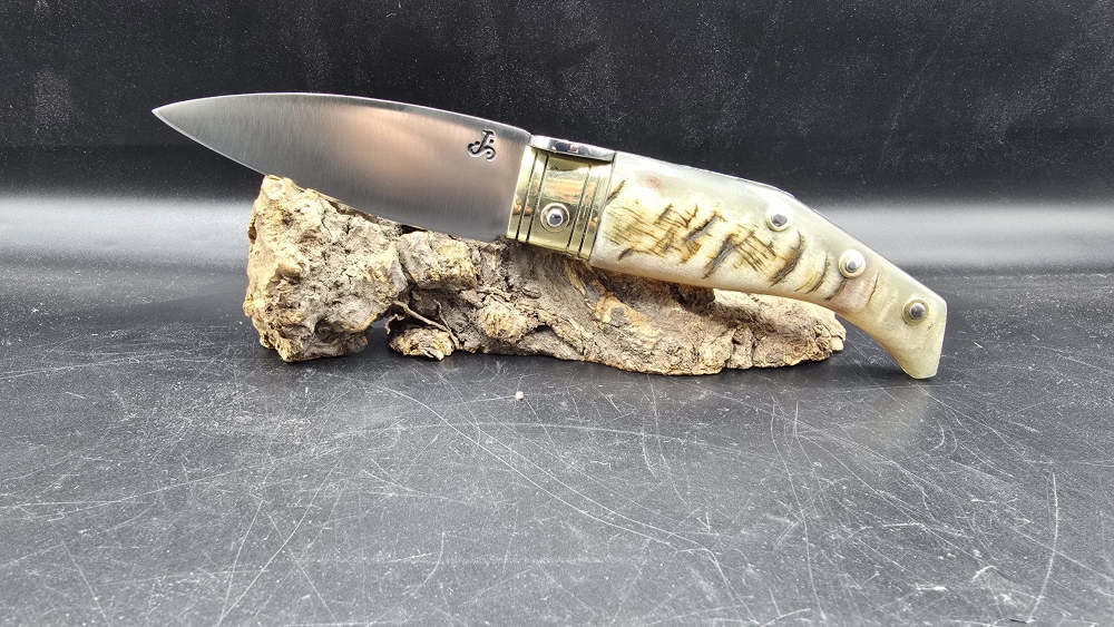 seguro de ventana, virola en latón, acero D2 hoja de 9,5cm, costilla decorada a lima y cabo de carnero.
